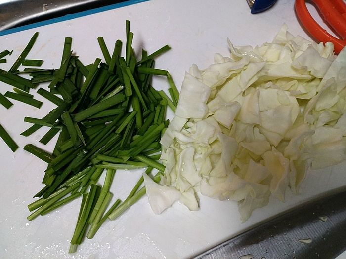 면이 익는동안 부추와 양배추를 츄츄츄츄 썰어준다.